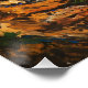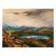 A scenic view captures a mountain range under a vast sky, with a serene lake nestled among lush green and rocky terrain. The contrasting colors of the landscape create a dramatic and peaceful atmosphere.