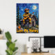 Este trabalho de arte captivador apresenta um urso, vestido de bombeiro com capacete e óculos de sol, profundamente imerso numa "rapsódia" numa guitarra acústica enquanto tocava no telhado de uma cabana russa de madeira. Uma lua de cheio grande e luminosa e estrelas espalhadas iluminam o céu noturno texturizado, com árvores altas e verdes definindo a cena. Um pote de mel fica no chão abaixo, e "Love My Honey" aparece de forma destacada. A vibrante e texturizada escova cria uma atmosfera viva e entusiasmante, transmitindo perfeitamente a vibração doce e caprichosa deste concerto único ao ar livre.