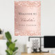 Um poster de boas-vindas para um Chá de fraldas glamouroso. Um fundo rosa dourado decorado com confete. Personalize e adicione um nome. Traseira: sem design