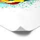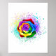 Rosa grande e florescente com pétalas arco-íris sobre fundo branco, pintadas com pedaços de tinta colorida e brilhante. 3d