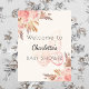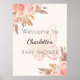 Uma poster de boas-vindas para um Chá de fraldas, celebrando uma menina. Um fundo bege macio decorado com rosas cor-de-rosa, florais, grama-pampas e uma borboleta grande. Personalize e adicione um nome.