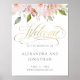 Esta bela placa de boas-vindas do casamento apresenta um roteiro luxuoso de ornamentado de ouro falso, com uma borda de delicados rosas cor-de-água rosa.