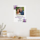 Este sinal de boas-vindas do Aniversário do Casamento tem uma elegante caligrafia de script, uma estrutura dourada com 1 foto especial e rosas roxos. Você pode personalizar este sinal com seus detalhes de aniversário de casamento.