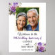 Este sinal de boas-vindas do Aniversário do Casamento tem uma elegante caligrafia de script, uma estrutura dourada com 1 foto especial e rosas roxos. Você pode personalizar este sinal com seus detalhes de aniversário de casamento.