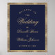 Um sinal de casamento vintage e elegante para um casamento com cores de casamento azul-marinho e dourado. O fundo é azul-marinho. Tem bordas douradas florais com decorações intricadas de rosas silvestres. Todo o texto é dourado.