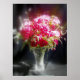 Um vaso cristal de rosas vermelhas e minúsculas flores silvestres cor-de-rosa brilham dramaticamente radiantes ao sol da tarde.