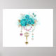 Chave de ouro antiga com rosas de turquesa de tendência, decoradas com folhas de ouro branco e miçangas cor-de-rosa e azuis. Cor agradável. Rosas de turquesa. Ouro branco. Tifania azul.