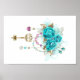 Chave de ouro antiga com rosas de turquesa de tendência, decoradas com folhas de ouro branco e miçangas cor-de-rosa e azuis. Cor agradável. Rosas de turquesa. Ouro branco. Tifania azul.