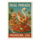 Travel poster featuring the iconic Rose Parade in the United States, vintage festival poster style. Grand floral floats fully covered in roses and fresh flowers moving along a sunlit boulevard in Pasadena, California, with marching bands and spectators in the background. Emphasis on detailed flower textures and elegant float designs. Retro color palette: rose pink, cream, warm red, soft green, sky blue. Clean graphic composition with subtle grain texture. Bold classic typography: “ROSE PARADE – PASADENA, USA”. Vertical 2:3 layout, high-resolution, suitable for print.