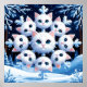 Uma ilustração encantadora com o tema do inverno, com faces brancas de gato formando um padrão de floco de neve em meio a uma paisagem de neve, simbolizando a criatividade e a alegria festiva.