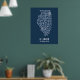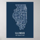 Poster gráfico e simples com mapa do Estado de Illinois com suas principais estradas em um fundo azul marinho.