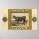 Arte de rótulo de produto de ilustração antiga anúncio apresentando refrigerante super bicarbonatado da marca Dwight. O texto diz; primeiro, mais barato, melhor, John Dwight & Company, Nova York. Publicidade antiga apresentando uma vaca em pé em um campo de fazenda.