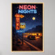 This litho style poster captures the quiet, electric mood of the Mother Road after dark. The design features the iconic neon glow of a roadside motel against a deep desert sky, giving you a high-quality piece of history for your wall. As part of a larger Route 66 series, this poster is designed to be collected and hung alongside other stops from the set, letting you bring the full experience of the open road into your home.