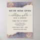Pôster Roxo Iridescente Dourado Glam Glitter Negócios Aberto. Este design apresenta uma fonte de estilo de assinatura sofisticada contra um belo fundo moderno de brilho iridescente. Perfeito para um salão de beleza, cabeleireiro, maquiador ou cosmetólogo.