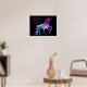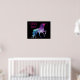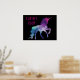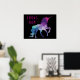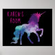 Uma silhueta colorida de um unicórnio mágico em tons de azul e roxo é personalizada com seu nome e a palavra Sala em fontes brilhantes de tendência rosa. O fundo é preto para mostrar seu nome e a imagem. Usando as ferramentas de edição na tela, você pode mudar facilmente a cor da fonte, o estilo e o tamanho da fonte para criar seu próprio poster exclusivo para seu dormitório ou quarto.