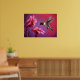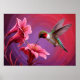 Essa imagem vibrante e parecerosa captura o momento encantador de um beija-flor em voo de médio, suas penas verdes e rubi iridescentes brilhando à medida que penetra delicadamente néctar de um aglomerado de flores de hibisco rosa-claro. As asas do beija-flor estão embaçadas, sugerindo um movimento rápido, enquanto seu corpo elegante e cores marcantes se destacam contra um fundo impressionista de púrpuras profundas e vermelhos. As flores, com suas pétalas vívidas e estames de ouro, são renderizadas em detalhes ousados, parecidos com pinceladas, acrescentando uma sensação de textura e vitalidade. A composição completa exude um senso de movimento, cor e beleza natural, misturando realismo com uma qualidade artística, quase sonhadora, que celebra a delicada interação entre o pássaro minúsculo e seu meio floral.