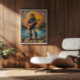 Esta pintura dinâmica captura um leão poderoso, adornado com óculos de sol e um casaco de couro, soltando um "rugido selvagem" através de sua guitarra elétrica. Ele está em pé em um píer de madeira rústico, com vista para um lago azul sereno com florestas de pinheiros distantes sob um céu brilhante. O uso de pinceladas ousadas e texturizadas pelo artista traz uma energia crua para a cena, transmitindo perfeitamente a atitude "Rock or Die".