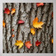 Capture the cozy feeling of the season with this rustic design. It features a detailed photograph of vibrant red, orange, and yellow maple leaves resting on textured tree bark. The rich fall colors and natural wood grain pattern create a warm, woodland atmosphere.