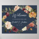 Bem-vindos convidados para o seu casamento com nosso poster Rustic Bloom, com culturas botânicas de cor aquática e flores em cores ricas do outono, com "bem-vindos a nossa felicidade para sempre", seus nomes, e data de casamento em uma mistura de serifas e tipos de caligrafia tradicionais.