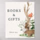 Woodland themed baby shower books and gifts poster sign featuring rustic winter forest and animals design.