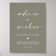 O nosso conselheiro verde sábio e o sinal de Mesa de casamento combinam perfeitamente o estilo contemporâneo com um sentimento sincero. O fundo verde de sábio apresenta a moderna caligrafia dourada, convidando convidados a compartilhar seus desejos e sabedoria. Perfeito para recepções, chás de panela ou festas de noivado. Personalize-o com seus detalhes de eventos para um toque verdadeiramente personalizado. Capturar memórias e amor!