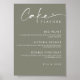 Aumente sua mesa de sobremesa de casamento com nosso Sage Green Modern Menu Cake Sign. Esta design minimalista apresenta uma tipografia elegante em um fundo verde de sábio sereno, perfeito para mostrar seus sabores e ingredientes de bolo. Personalize-o online para corresponder ao seu tema de casamento e escolha entre vários tamanhos. Ideal para adicionar um toque de sofisticação ao seu dia especial