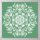 Esta mandala branca senta-se sobre um fundo verde-cinza. As cores são naturais e relaxantes. Parte da coleção Pras Mandala.