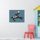Desenho de tinta de um guitarrista elétrico de esqueleto em um grande salto de rock. B/W, t-shirts, camisas de suor, impressões, presentes.