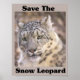 Um close up de um leopardo-da-neve com as palavras Save The Snow Leopard ao seu redor.