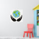 Salve o planeta Terra e mãos Poster. Ela apresenta a Terra em verde e azul com o texto "Ame-a, proteja-a, respeite-a, salve-a" à sua volta e as mãos que a seguram com cuidado.