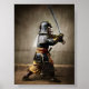 Uma foto colorida impressionante de um povo japonês vestido em uma armadura japonesa tradicional, cheio, carregando uma espada de katana em uma pose de luta.