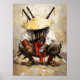 Intense palette knife oil painting of a traditional samurai in orange robe and wide hat, resting with crossed swords on his back. Thick impasto strokes in warm oranges, grays, and deep shadows create dramatic texture and contemplative mood. Perfect martial arts wall art for modern homes, offices, dojo decor, or collectors seeking bold, expressive warrior portraits. High-quality print captures rich brushwork and powerful atmosphere.
