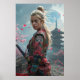 A powerful illustration of a female samurai warrior, traditional tattoos, standing under the full moon with cherry blossoms around. Strong composition inspired by Japanese culture.