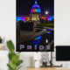 Uma fotografia noturna captura a prefeitura de São Francisco banhada em cores vibrantes do arco-íris. A cúpula icônica, adornada com a bandeira do orgulho LGBTQ+, destaca-se contra o céu escuro. A fachada do prédio é iluminada com um espectro de cores, criando uma exibição deslumbrante. No primeiro plano, uma piscina refletora reflete as luzes coloridas, adicionando um toque sereno e etéreo à cena.