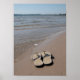 As Sandals naturais no Impressão de Poster da praia mostram uma fotografia natural de dois chinelos de couro numa praia arenosa ao lado do lago Michigan num dia quente de verão. Só de olhar para isso, você se sente como se estivesse de férias!