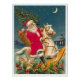 Vintage illustration of Santa Claus on a white wooden horse, carrying a Christmas tree with colorful baubles and a basket full of toys under a clear blue night sky with a bright shining moon and stars on a cold winters night.