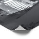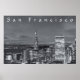 Esta fotografia a preto e branco captura o horizonte de São Francisco à noite. A icônica Pirâmide Transamérica é destacada entre outros arranha-céus iluminados. As luzes da cidade refletem sobre a água no fundo, criando um efeito de sombreamento. O céu está cheio de nuvens, adicionando profundidade à cena. O humor geral é sereno e urbano.