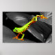 O sapo da árvore verde limão Acrobática com listras laranja e pretas na barriga, parece que ele está fazendo uma banca. Anfíbio saltante muito colorido sobre fundo preto e branco.