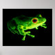 Um sapo verde fraturado com olhos laranja ferozes contra fundo preto.