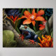 Sapo verde de dardo ilustrado nos ramos de árvores cercados por flores tropicais vibrantes numa floresta tropical.