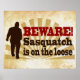 Beware! Sasquatch is on the loose! This funny bigfoot item is sure to turn heads. Design features the silhouette shape of sasquatch, with goldtone rays of light coming from behind and fun block text. Share your passion for the yeti with this humorous gear. Whether you believe in big foot or not, here's a fun way to show you care.