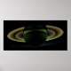 A espaçonave Cassini, da NASA, deu uma vista gloriosa de Saturno, tirada enquanto a espaçonave estava na sombra de Saturno. As câmeras foram voltadas em direção a Saturno e ao sol para que o planeta e os anéis estivessem iluminados de trás para frente. (O sol está atrás do planeta, que está protegendo as câmeras da luz solar direta.) Além do esplendor visual, essa geometria visual especial, em fase muito alta, permite aos cientistas estudar fenômenos anais e atmosféricos com pouca facilidade vistos em fase mais baixa. Como imagens como esta só podem ser tiradas enquanto o sol está por trás do planeta, esta bela vista é ainda mais precioso pela sua raridade. A última vez que a Cassini capturou uma visão como esta foi em setembro de 2006, quando capturou um mosaico processado para se parecer com a cor natural, intitulado "In Saturn's Shadow-The Pale Blue Dot" (Veja PIA08329). Nesse mosaico, o planeta Terra colocou em uma aparência especial, o fazer "Na sombra de Saturno", uma das imagens mais populares da Cassini até hoje. A Terra não aparece neste mosaico, pois está escondida atrás do planeta. Também são capturadas nesta imagem duas das luas de Saturno: Enceladus e Tethys. Ambos aparecem no lado esquerdo do planeta, abaixo dos anéis. Enceladus está mais perto dos anéis; Tethys está embaixo e à esquerda. Esta visão se aproxima do lado não iluminado dos anéis de cerca de 19 graus abaixo do plano do anel. Imagens tiradas usando filtros espectrais infravermelhos, vermelhos e violetas foram combinadas para criar esta visualização de cores melhoradas. As imagens foram obtidas com a câmera de ângulo largo da nave Cassini em 17 de outubro de 2012 a uma distância de aproximadamente 500 mil milhas (800 mil quilômetros) de Saturno. A escala de imagens em Saturno é de cerca de 30 milhas por pixel (50 quilômetros por pixel). A Missão de Solstício Cassini é um esforço conjunto dos Estados Unidos e da Europa. O Laboratório de Propulsão a Jato, uma divisão do Instituto de Tecnologia da Califórnia em Pasadena, gerencia a missão da Diretoria de Missão Científica da Nasa, Washington, D.C. O orbiter da Cassini foi projetado, desenvolvido e montado no JPL. A equipe de imagem é formada por cientistas dos Estados Unidos, Inglaterra, França e Alemanha. O centro de operações de imagens e o chefe da equipe (Dr. C. Porco) estão baseados no Instituto de Ciência Espacial em Boulder, Colo. Para obter mais informações sobre a Missão de Solstício da Cassini, visite http://ciclops.org, http://www.nasa.gov/cassini e http://saturn.jpl.nasa.gov. Crédito: NASA/JPL-Caltech/SSI Lançado: 18 de dezembro de 2012 (PIA 14934)
