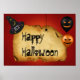 Uma ilustração do Dia das Bruxas com um antigo papel, chapéu de bruxa, aranha e 2 balões de pilha num fundo vermelho.