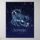Impressão com o símbolo de Scorpio em azul-prateado suave, sobreposto com as estrelas da constelação, contra um fundo de céu estrelado formando de azul-da-meia-noite a preto.