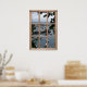 Poster que se parece com uma janela — barcos de pesca Esta cena da janela mostra um porto na Escócia. Os barcos de pesca estão amarrados na água tranquila deste porto tradicional, que data dos anos 1600. Uma janela de madeira rústica enquadra a cena tranquila, com as folhas das árvores criando um novo plano atraente. Além de você pode vislumbrar o mar aberto sob um céu nublado.