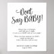 Este sinal de jogo de chá de fraldas bonito apresenta um título de script e seu texto personalizado. Use o formulário modelo para adicionar sua personalização. A cor de fundo pode ser alterada escolhendo "personalizar mais" na parte inferior do modelo. Como jogar: segure o poster no seu chá. Quando os hóspedes chegarem, deem-lhes uma espinha de roupa e lembrem-nos de não dizer "BABY" ou eles vão perder o alfinete! É tão fácil, qualquer um pode jogar. Dê um prêmio ao convidado que coleciona a maior quantidade de pregos no final do chá.
