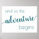 Azul-turquesa-luxuosa-azul-aqua, aquamarina, seafoam, e horizontal branca "e assim a aventura começa" chá, festa ou sinalização mesa de recepção com um roteiro divertido e casual, escrito à mão. O clássico design inclui uma moderna camada de tipografia de citações feitas à mão. A bela fonte com uma cor de fundo personalizável facilita o ajustado de qualquer tema. Para outras cores ou produtos correspondentes, visite a loja justFharryn Zazzle ou entre em contato com o designer, c/o fharryn@yahoo.com Todos os direitos reservados. #zazzlemade