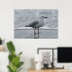 Esta gaivota caminha pela praia com a água chegando muito perto de seus pés molhados.
