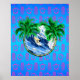 Design de surf de uma surfista montando uma onda, emoldurada por palmeiras tropicais. Fundo azul do oceano e Tartarugas do Mar de Honu do Havaí cor-de-rosa e padrão das Máscaras de Tiki.