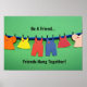 Uma linhagem adorável com roupas coloridas de criança penduradas nela, e uma mensagem de amizade: "Seja um amigo. Amigos se mantêm juntos."